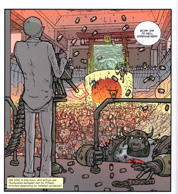 I’ve picked up the first three issues of The Manhattan Projects, written by Jonathan Hickman and drawn by Nick Pitarra, and I am finding it absolutely delightful. The premise is pure alternate nuclear history joy: “What if the research and development department created to produce the first atomic bomb was a front for a series of other, more unusual, programs? What if the union of a generation’s brightest minds was not a signal for optimism, but foreboding? What if everything . . . went wrong?” (from the cover). Already in the first three issues, a insane Robert Oppenheimer suffers from multiple personality disorder, and gets to mow down killer Japanese samurai robots